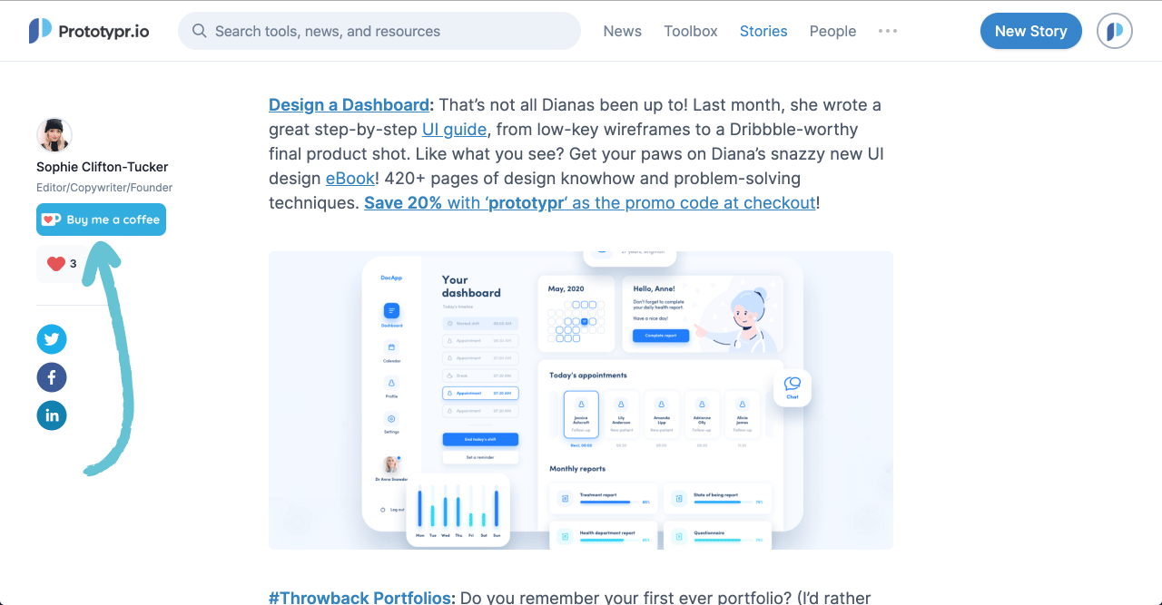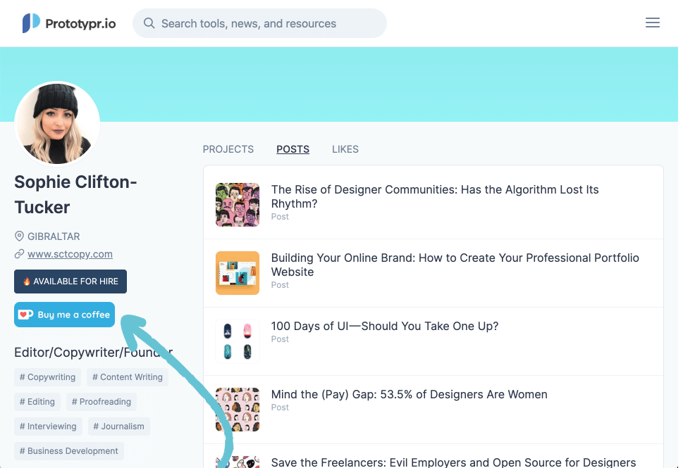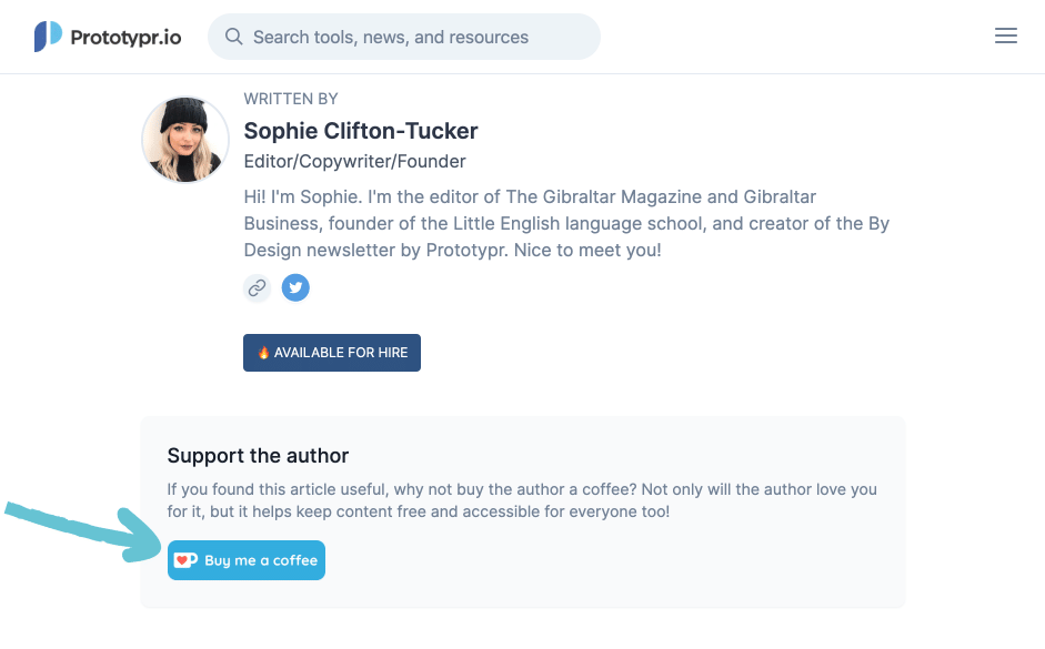 Just update your Prototypr profile with your Ko-Fi link, and a ☕️ ‘Buy me a coffee’ badge will appear on all your articles. Check out the footer and sidebar of this post as an example.