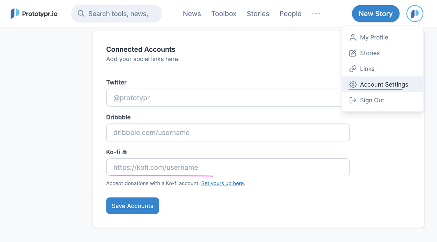 If you’ve not yet got a Ko-fi profile, create one here first, and then update the Ko-Fi field at the bottom of your profile settings: