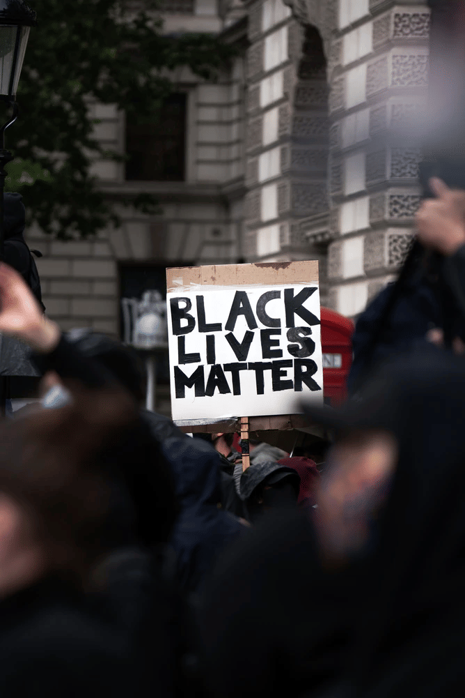 A concise way to add detail: A painted Black Lives Matter cardboard sign being held anonymously in a blurred out crowd in front of a stone building.