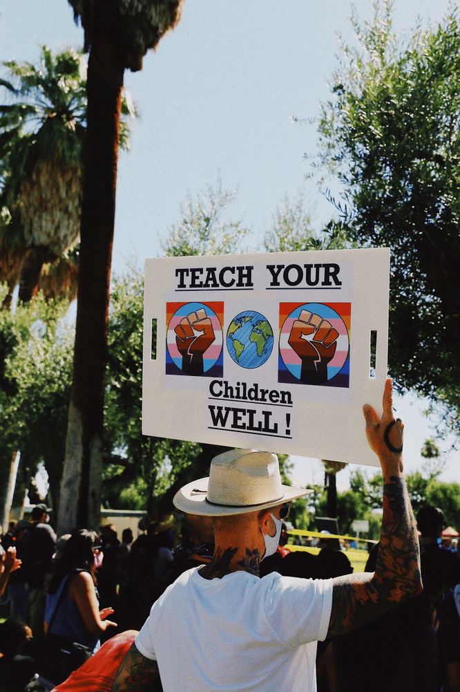 A tattooed person holding a sign that says, “Teach your children well,” in a crowd of people. In the middle of the sign, there’s an illustration of the earth with 2 raised fists on either side that have a rainbow pride square background, a trans pride circle background, and brown skin tone stripes on the fists.