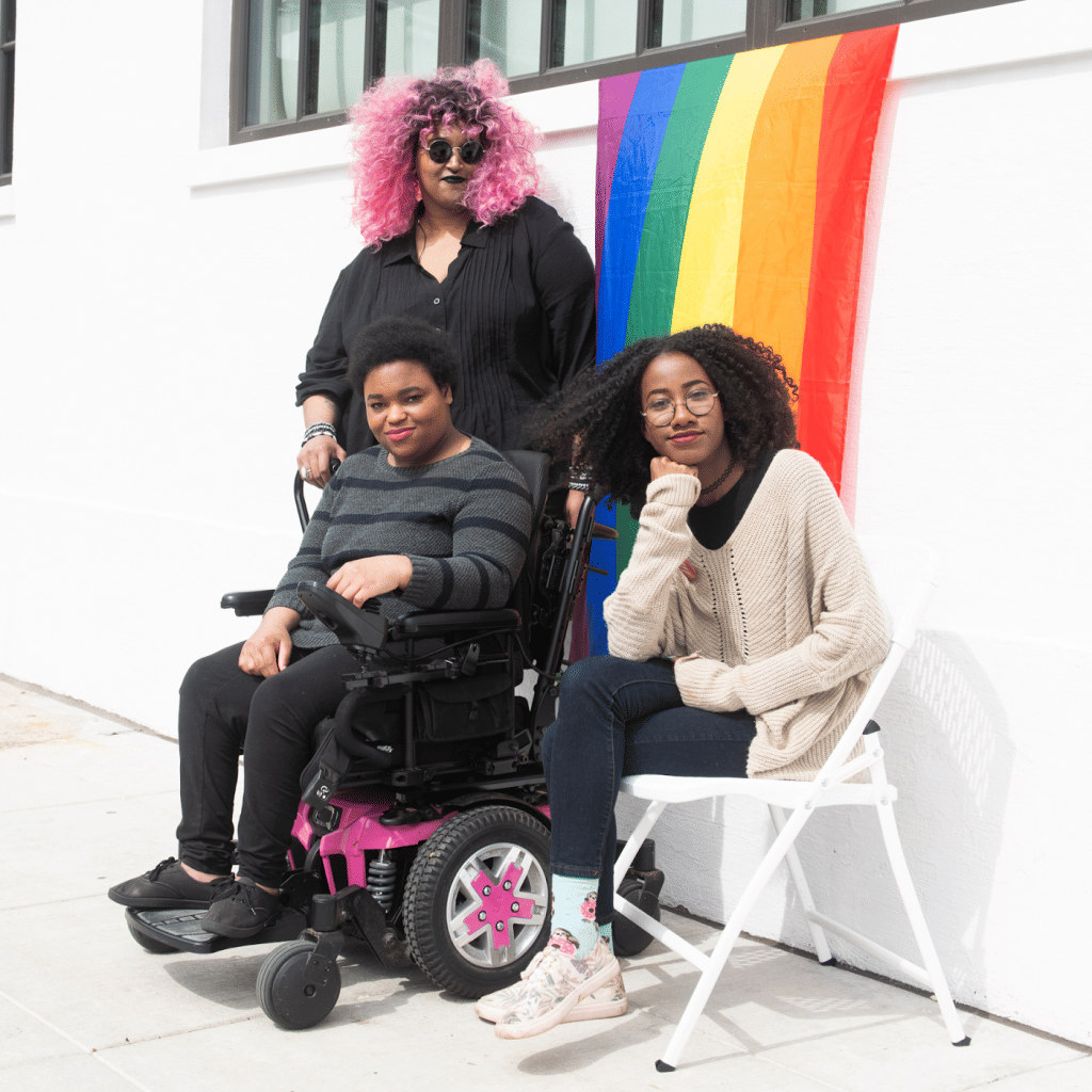 Three Black and disabled folx (a non-binary person holding a cane, a woman sitting in a power wheelchair, and a woman sitting in a chair) partially smiling at the camera while a rainbow pride flag drapes on the wall behind them.