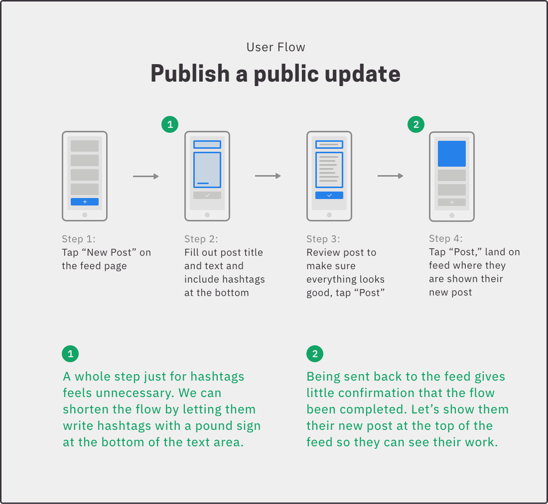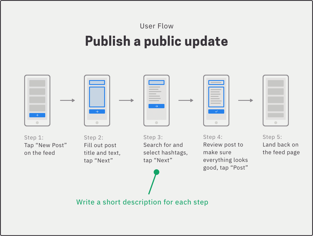 Let’s use a simple example. We’ll create a user flow for publishing a new post on a fictional social media app.