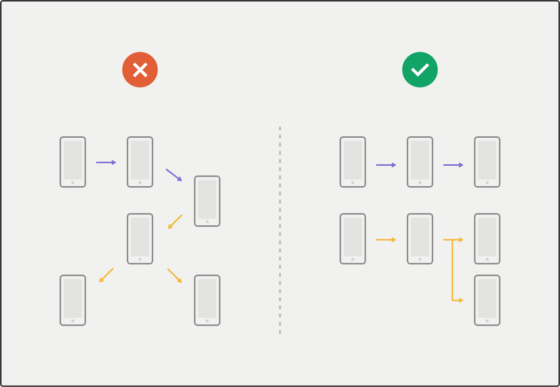 User flows work so well because they tell a story to the reader. To clarify that story, we’ll need to keep things focused and clear, and only go in one direction.