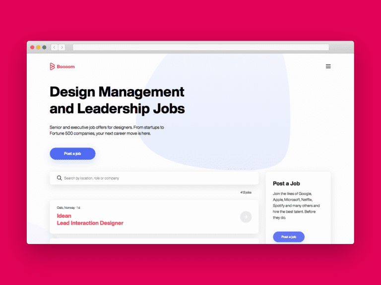 Boooom is a leading job board for design management and leadership opportunities. With hundreds of job offers from top companies in 25+ countries, Boooom’s mission is to connect great design leaders with high profile opportunities, in a hand-picked list of organizations.