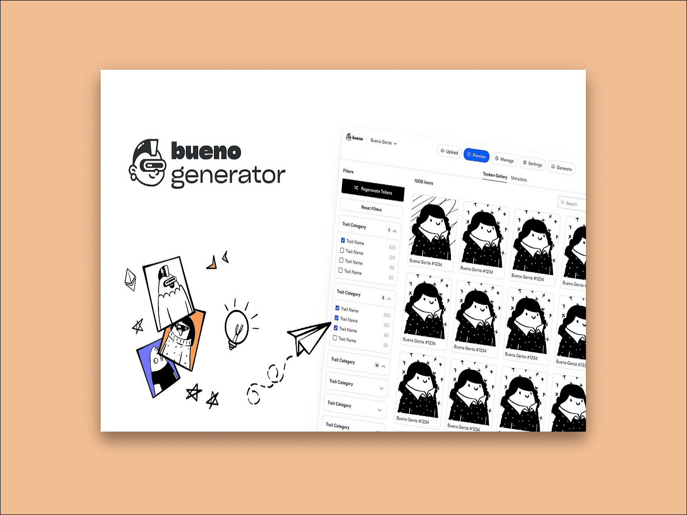 Easily generate NFT collections and Smart Contracts with Bueno. This set of no-code tools for NFT creators will help you develop your NFT collections more efficiently, enabling you to: