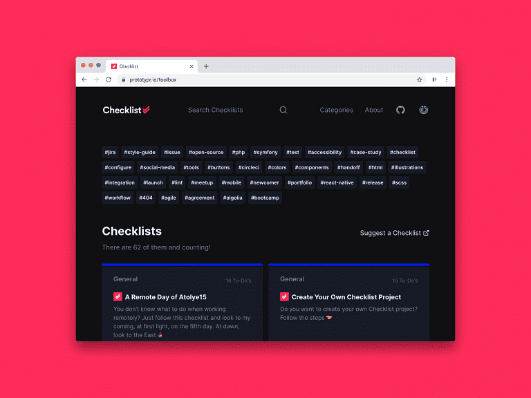 Missing a step in your process? Checklist has got your back! This website includes dozens of checklists for developers and designers, and other roles, so that you know exactly what to do next when working and delivering a digital product.