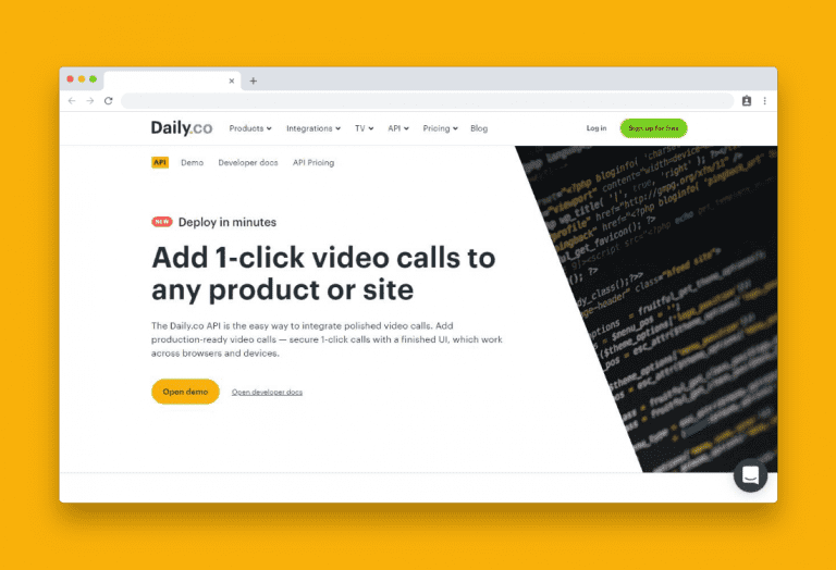 The Daily.co API is the easy way to integrate polished video calls. Add production-ready video calls — secure 1-click calls with a finished UI, which work across browsers and devices.