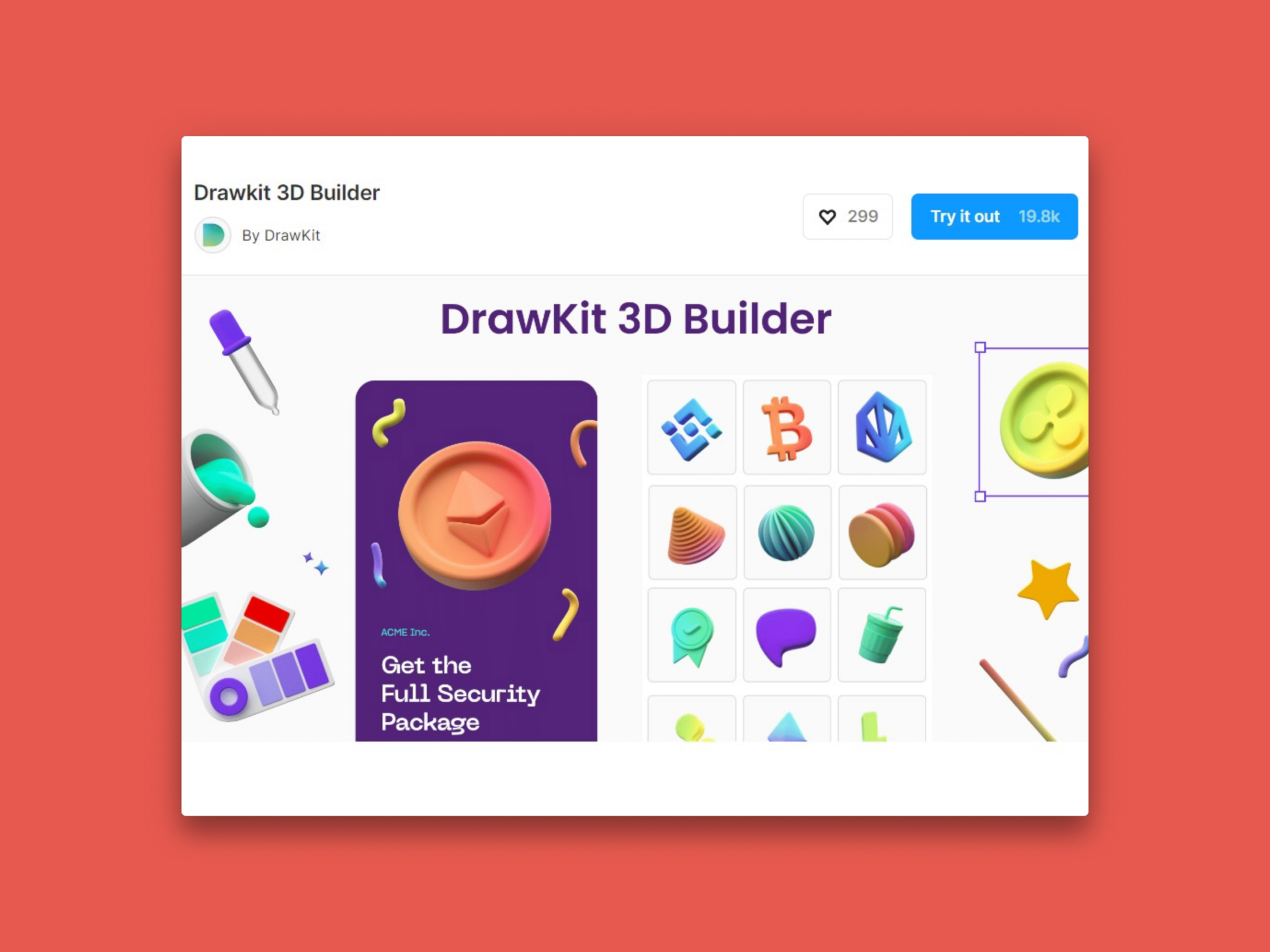 Build beautiful 3D objects in Figma with DrawKit 3D Builder. This 3D library plugin gives you a huge set of options to mix and match 3D illustrations and icons and easily drop them in your Figma file.