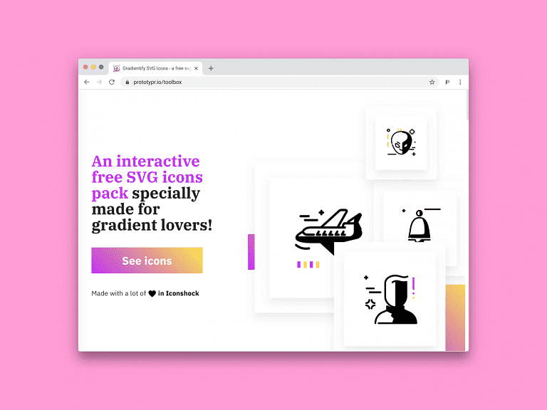 Gradientify gives you SVG icon gradients. That’s right! Add gradients to your SVGs, and make the most out of this icon collection. The tool comes with 100+ pre-made gradients, and it’s fully customizable and free. Have fun!