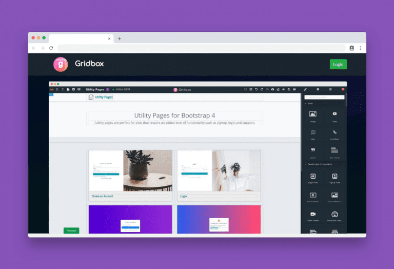 Gridbox features a super simple drag and drop interface, with a rich library of prebuilt Bootstrap and HTML 5 elements that lets you create html pages faster. You can Work visually or with code, starting from a blank canvas or by using existing projects: easy to customize, fast to deliver.