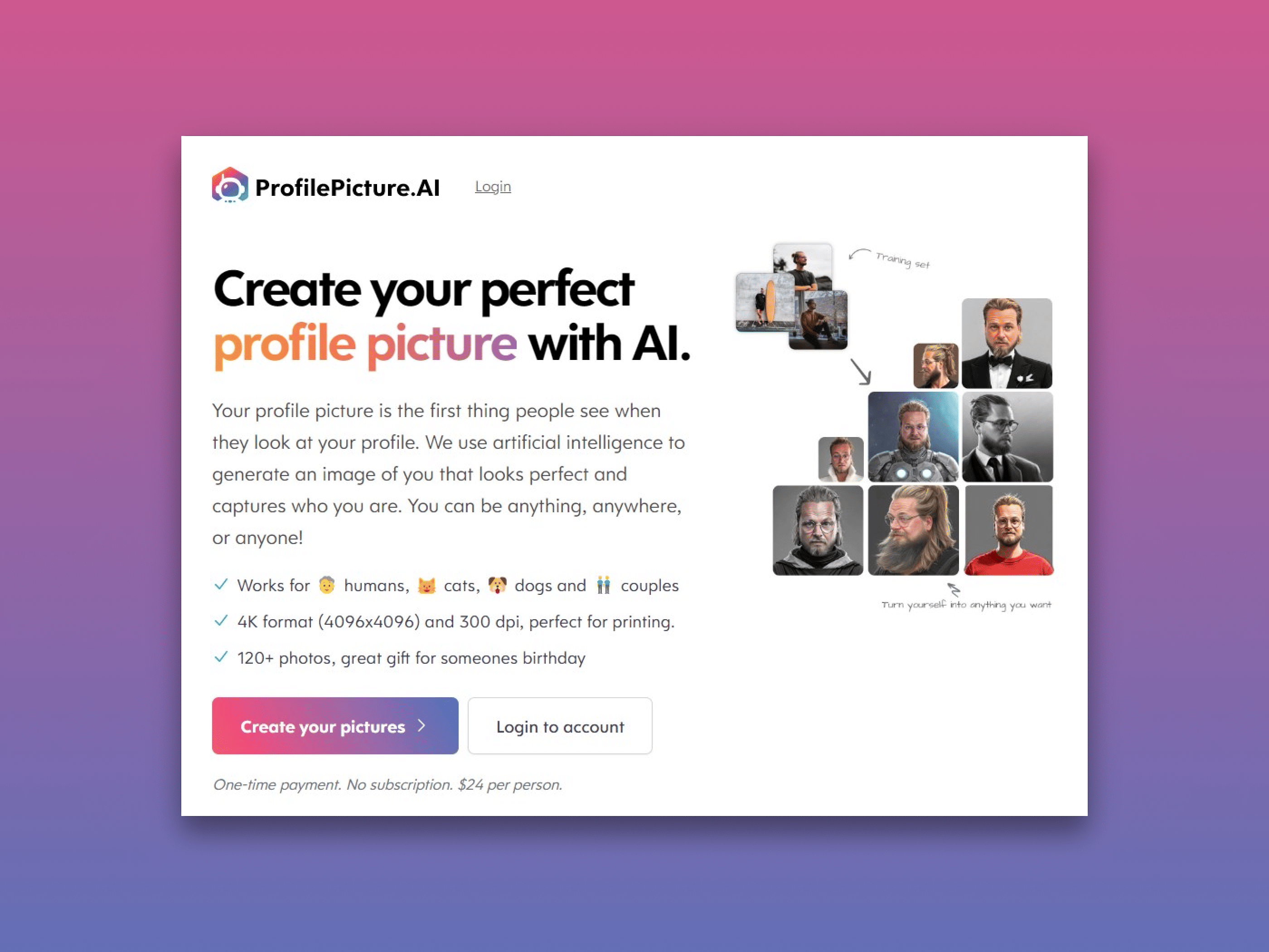 Profile Picture AI is an AI-powered avatar generator. Create beautiful and unique profile pictures for you, your dog or cat, or anything! This tool...