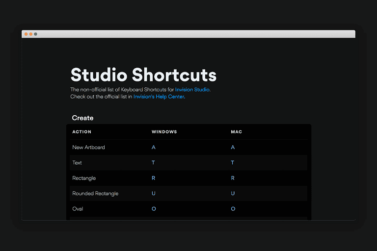 List of Keyboard Shortcuts for Invision Studio, by Pablo Stanley.