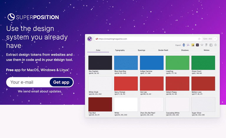 Superposition enables you to use existing design systems from any website. It extracts colors, typography, shadows and other design elements, and let’s you export them to CSS and JavaScript. Besides that, you can also export it to Adobe XD using the XD plugin.