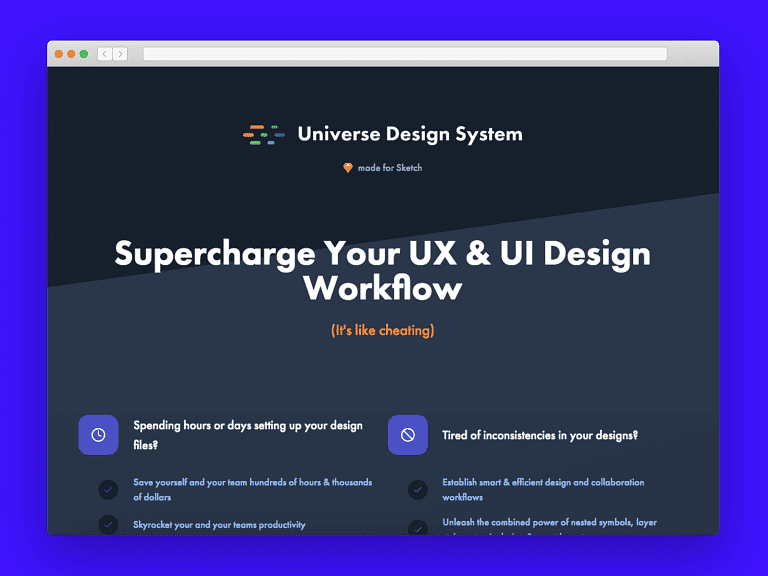 Universe is a design system made for Sketch. You can use it to make your workflow more efficient and avoid inconsistencies in your designs, as well as work better with your team.